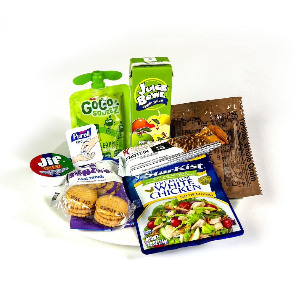 Kit Contains: Starkist Low Sodium Chicken, Wheat Flour Tortilla, Chickpea Hummus, Apple Juice, Oreo Cookies, Jif – Peanut Butter, Apple Sauce, Special K Protein Bar, Relish – Sweet, Cutlery Kit, Hand Sanitizer